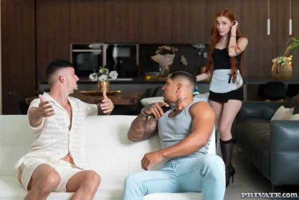 Released: December 22, 2025The redhead Megan Murkovski works as a maid for a millionaire who, away on a business trip, has left her alone with his son, who has also invited his best friend over to watch a movie at a party they insisted on inviting her to. Since Megan has trouble speaking their language, they decided to put on a very easy-to-understand movie from www.private.com. Megan got very horny and confessed a secret to them: she fantasizes about getting together with two guys at once, and of course, she didn't miss the opportunity to make that fantasy come true. So watch her, spectacular, devouring two cocks in gagging blowjobs which soon turns into anal and DP until she ended up savoring two facials.